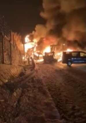 ავტოსაგზაო შემთხვევის შედეგად ხანძარი გაჩნდა და დაახლოებით 20 ავტომობილი დაიწვა.